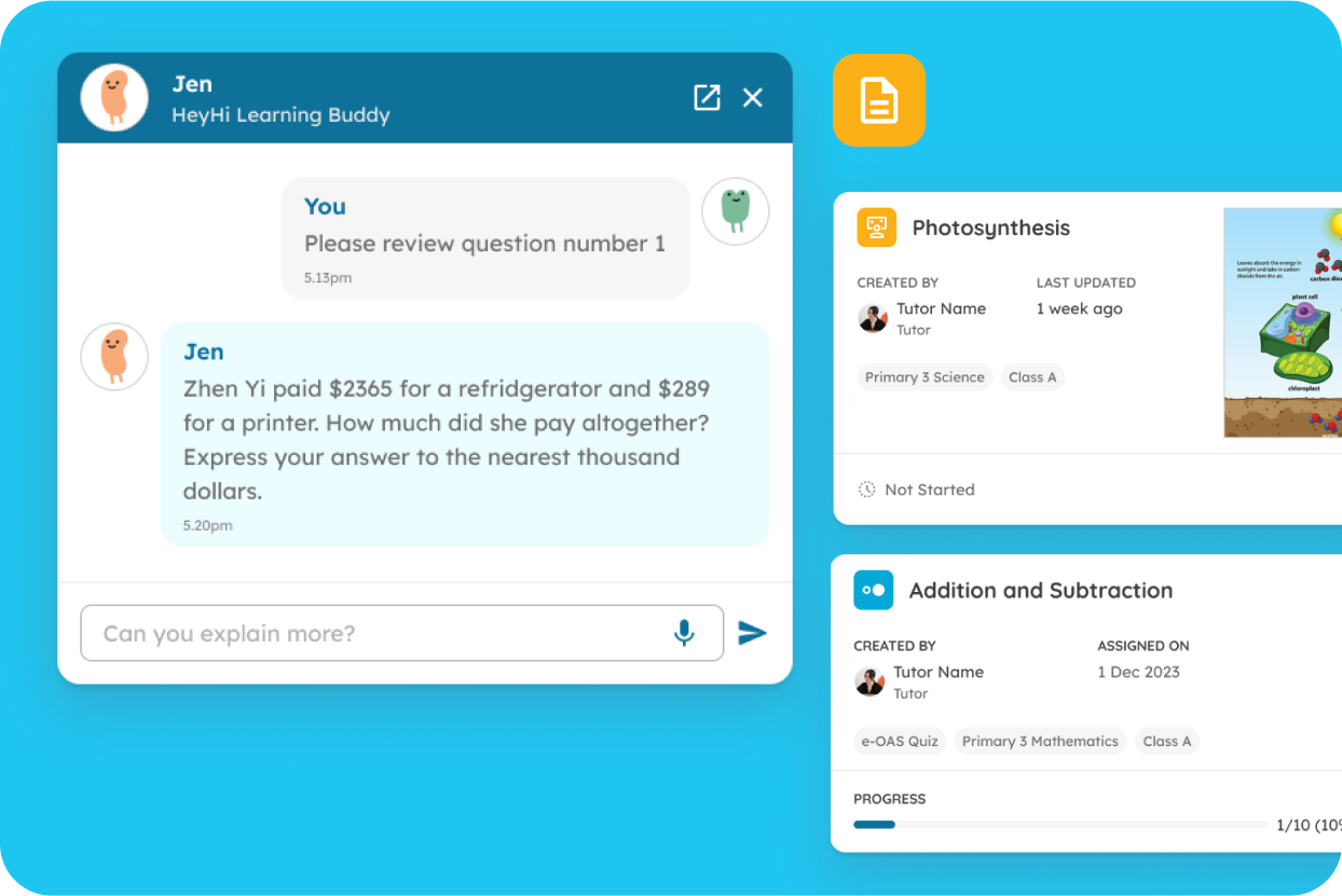 Learn at your own pace with HeyHi and unlock your full potential. Get assisted by our 24/7 AI Learning Buddy, get to know your learning gaps, and excel with personalised practices & materials.